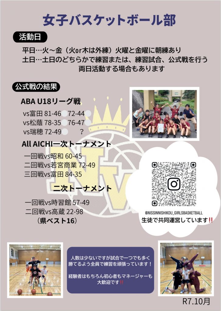 バスケットボール女子 2025年11月29日 私たち女子バスケットボール部は、基礎練習からしっかりと、1つ1つの練習を大切にしてやっています。部員全員が仲良く団結力では負けません。県大会を目指してチーム一丸となってがんばっています。 こちらからPDFファイルをダウンロードすることができます。 2021.10.3 更新 2021.4.30 更新 2022.1.20 更新 2022.8.5 更新 2022.10.03 更新