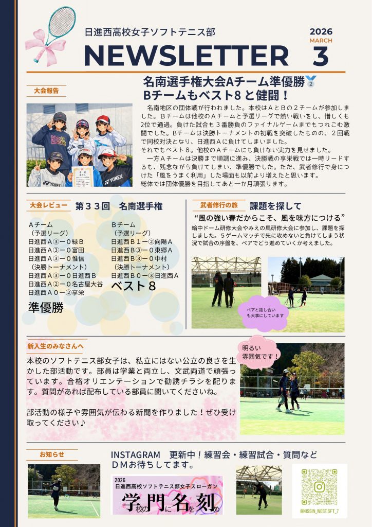 ソフトテニス女子 2026年3月10日 日進西高校ソフトテニス部 NEWS LETTER 3月号 この記事はこちらからダウンロードできます 愛知県内の公立高校の頂点に立ちました(R8.1.8更新) この記事はこちらからダウンロードできます この記事はこちらからダウンロードできます