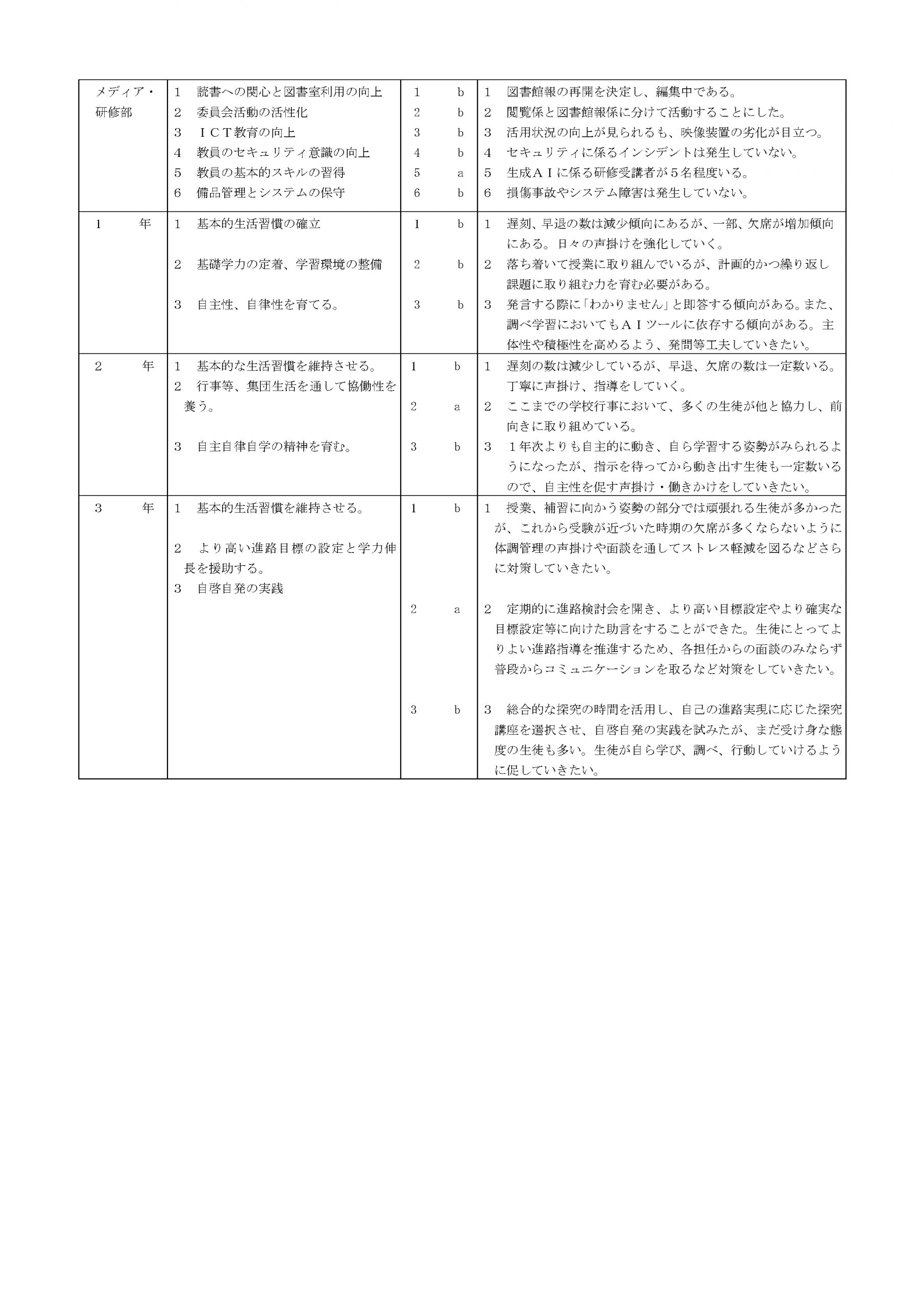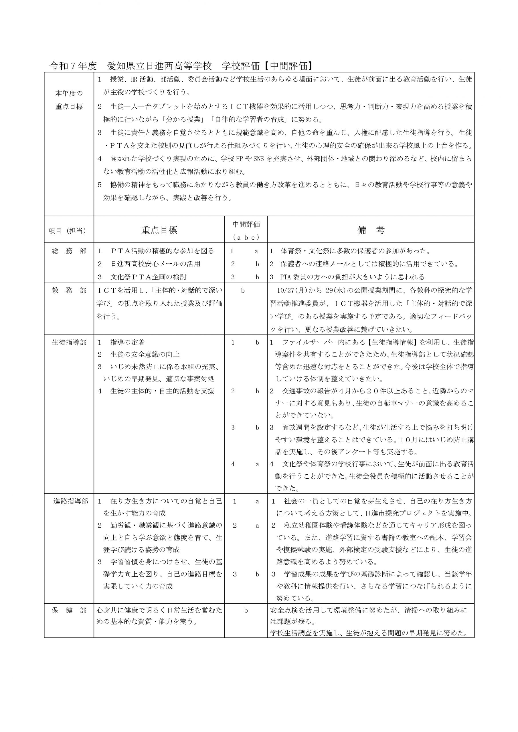 学校評価 2025年10月24日 令和7年度学校評価(中間評価)です。下の画像はクリックで拡大できます。PDF形式のファイルはこちらからダウンロードできます。 令和6年度学校評価(年度末評価)です。下の画像はクリックで拡大できます。PDF形式のファイルはこちらからダウンロードできます。 「令和5年度学校評価(年度末評価)」 を掲載しました。 ここをクリックダウンロード 「令和6年度学校評価(中間評価)」を掲載しました。 ここをクリック